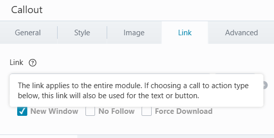 The tooltip for the link URL says the link applies to the whole module, but it only applies to the image.